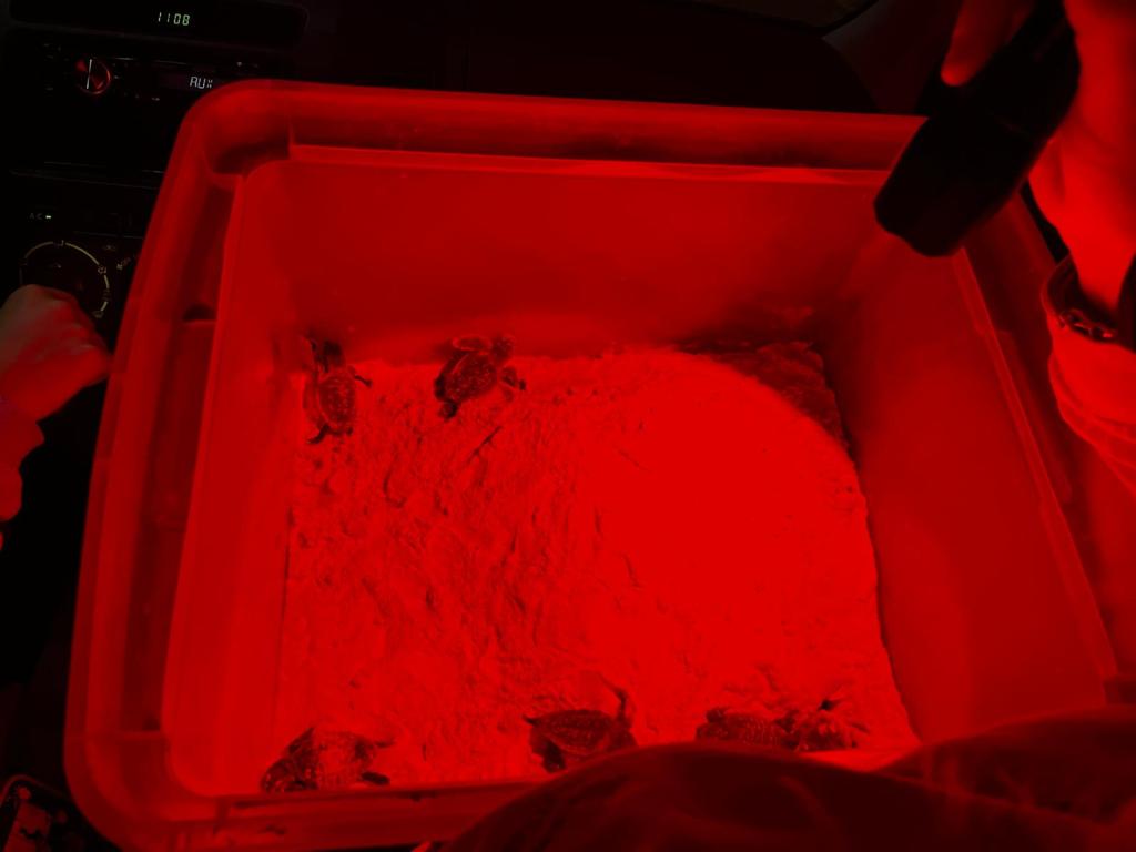 Maria the Turtle Project Officer had a call one morning from CONANP to say that someone had found two hatchlings on a beach just down the road. She yelled excitedly for the turtle team, and thankfully there was also room in the truck for me! We packed up a box and gloves (turtles have salmonella in their gut, so the eggs and babies tend to be covered in it) and headed to find the hatchlings. Five minutes away is a stretch of beach lined purely by hotels, we got there and a security guard for one pod the hotels had two hatchlings in a bucket in the shade. WE had a little look and realized they were loggerhead babies! On the night walks we had seen green turtles only so this was even more exciting. The shells look different even when they are this small, they have what look like spiky ridges running down the carapace, and the necks are thicker. We collected some damp sand into our box, with no sargassum and put the hatchlings in there to keep them cool.