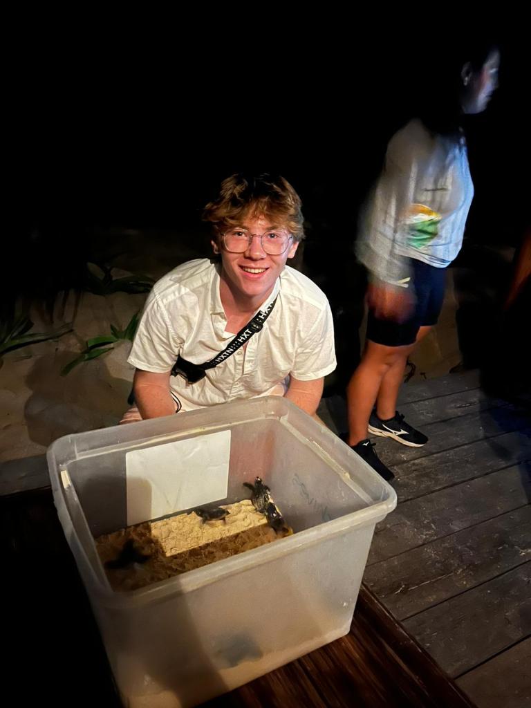 We covered all of the eggs and the hatchlings in sand as it was a bit too early for them to survive, they can breathe through the gaps in the sand and the damp sand also keeps them hydrated, and took them back to base in the box. The next day we checked and we had 3 hatchlings up on top of the sand so we called CONANP and agreed to meet them at the beach to release the babies!! We collected the box from base at 10pm and made our way to the beach, it was pitch black and by the time we got to the beach we had 6 hatchlings!! A local man allows CONANP to use his beach shack as a base for monitoring, and his family and lots of children had come to see the babies. We were getting ready to release them: you take them a few metres from the shore but they must find their own way to the sea as they will come back to nest there the following year, when another 2 heads popped up. After all of the trauma of a disturbed nest having been dumped with sargassum and then being moved in a box we ended up with 8 out of 9 eggs hatching!