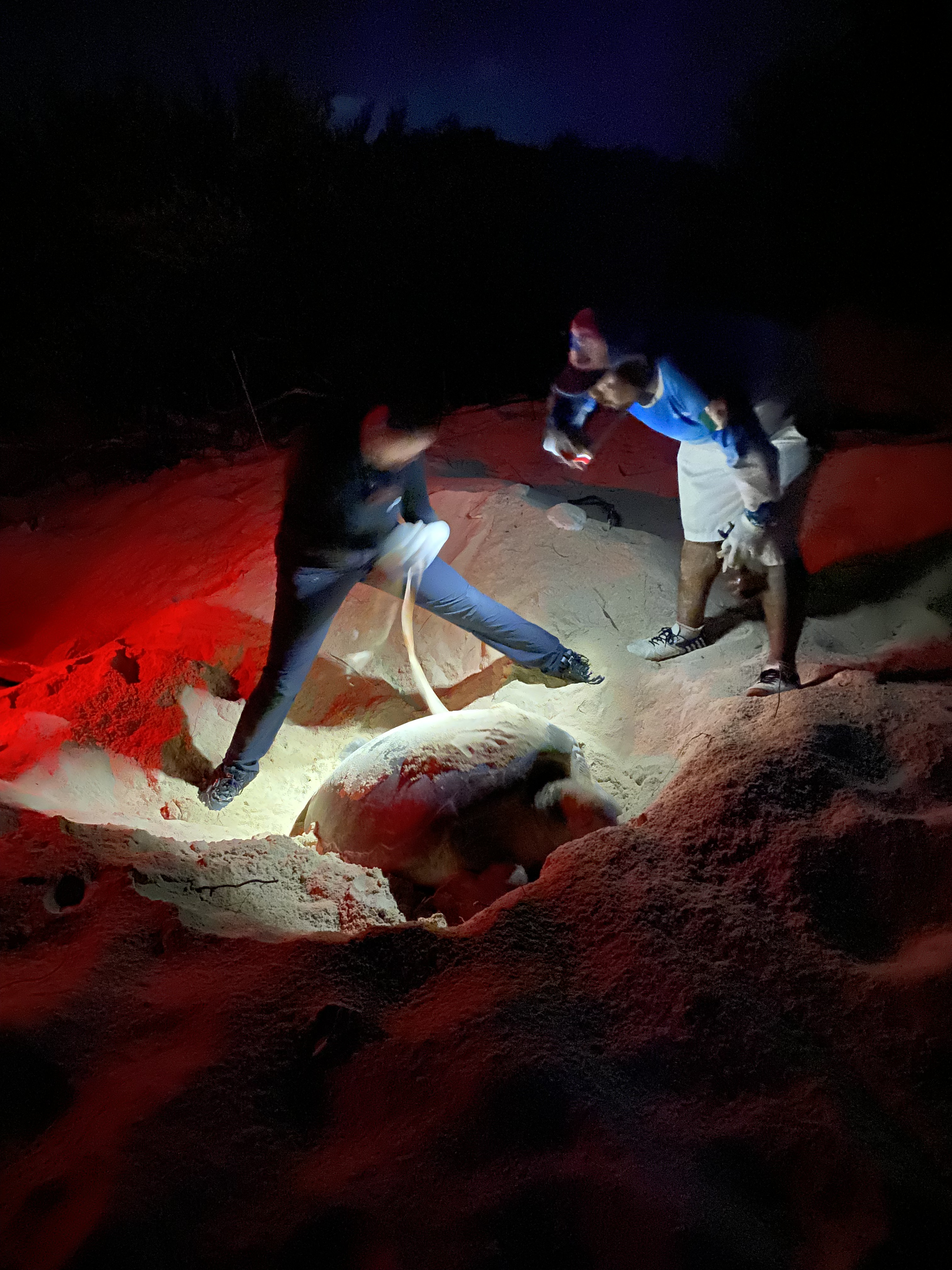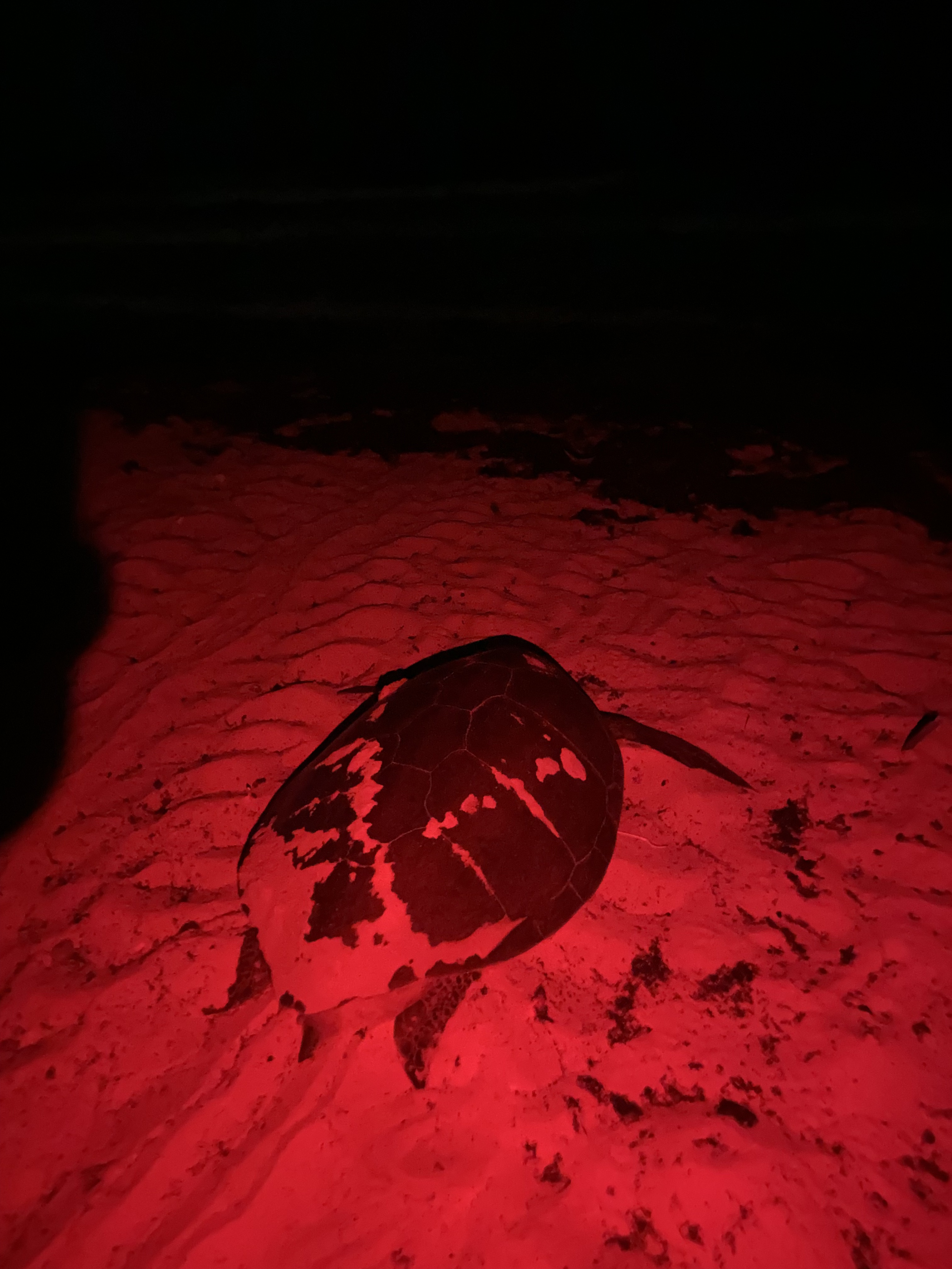 There were a few babies who had a carapace that had been deformed, normally curving more one way which made one front flipper useless as it got pinned to the sand so the propulsion across the sand was affected. The deformities we saw in the adult females were all caused by predators: propellor damage, missing flippers from shark attacks and shark bites out of their carapace. We finish up when there are no more turtles laying, or nests that have hatched and we haven’t cleared, and go back to the hut to clean our hands, record data and pick up kit. The drive home is slow and there are less people around. Restaurants have shut their doors for the night and houses are in darkness. I drop off the participants then make my way home to send a couple of photos to people in England who are up and about, as although its 3.30am here work has started at home. Exhausted I climb into bed and hope I will get a few hours sleep before I start work again the next day. I want to dream of the turtles I have gazed at tonight, memorizing their faces and slow movements. From nest to death these gentle creatures, so graceful in the water and vulnerably weighty on land, are dodging so many predators and damage from humans, be it poaching or unintentional damage from us encroaching into their world. These nights have left me physically and emotionally drained and yet buzzing from this snapshot into a world that feels so far away from my normal life. I have learned lots about the turtles and their habitat, have questions I didn’t know to ask before, and so much respect both for the majestic creatures I have been so privileged to see up close, and for the volunteers who do this several nights a week for months every nesting season.
