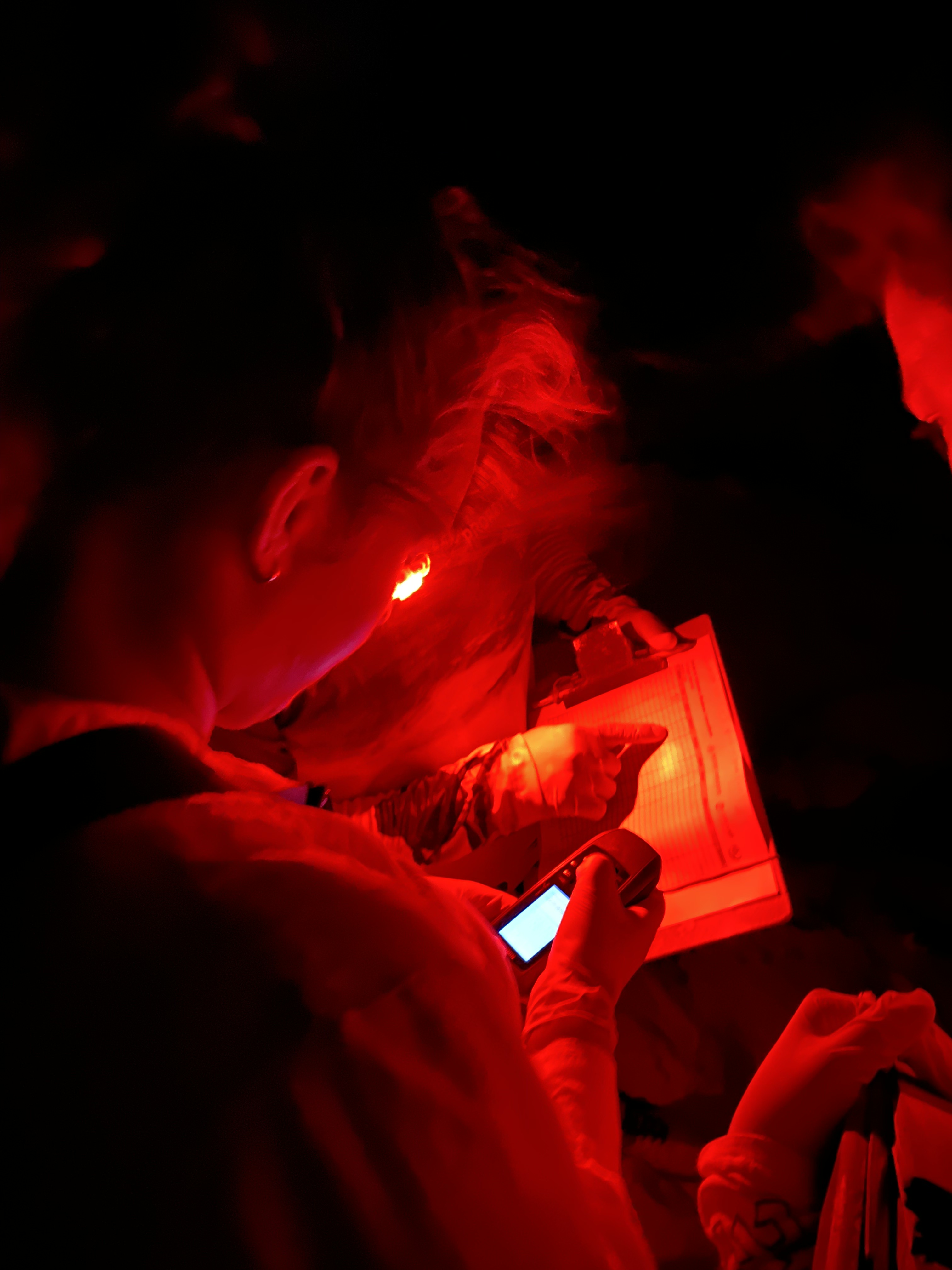 We quickly get past the hotels and their powerful lights and head into the dark, driving parallel to the mangrove forest. We all keep our eyes peeled for the reflection of eyes that could be a crocodile, but as yet they have stayed away. We do see bats, big spiders, and racoons who dart in front of the truck then away again, much like the pheasants at home on some kind of death wish. Suspension and spines jarring we move slowly along the road until we get to a clearing where CONANP park their vehicle. The hut that we are allowed to use as a base is a short walk from our vehicles and we go and get set up. We put on rubber gloves to protect against the salmonella, gather up posts to mark nests, a GPS tracker, bucket , tape measure, iodine solution and a little hand held tagging device. We split into two teams and head off in opposite directions along the beach. The sky is clear, stars and moon giving a little help outlining silhouettes against the overwhelming blanket of darkness. The red torches are more to confirm the sight of a turtle than to help traverse the undulating surface of the sand and inevitable holes and track marks from the slow moving creatures we are seeking. Our guides speak little English so we communicate as much in Spanish as we can, difficult in this darkness without the assistance of gestures and facial expressions.