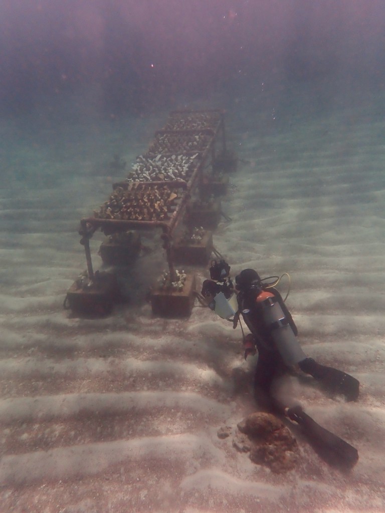 We had a request from Healthy Reefs for us to lead a photographer on a couple of dives to show them how bad the coral bleaching is. There is a worldwide bleaching event because the sea temperatures are too high and we are seeing corals here get more bleached by the day. It’s shocking how much they’ve changed just in the time I’ve been here. Staff and two participants went out for two dives so that this can be documented, and we got to just float around while the photographer with her incredible camera got all the footage needed. We have a participant here at the moment, Richard, who is great with a camera so he was also taking photos. He got me posing above a brain coral and a few of the photographer with her very fancy camera.