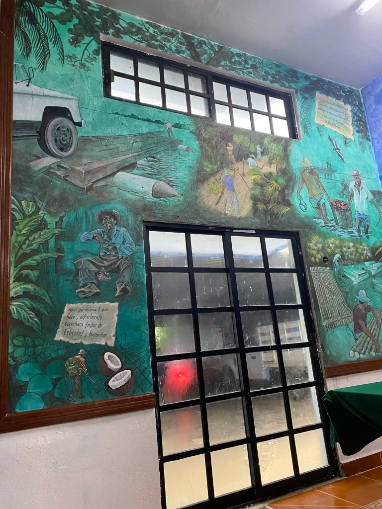 A grey morning arrived, it was still raining and dark so we dressed by torch light then we drove around to try and find breakfast, nothing. We went back to the shop to beg for hot water, thankfully Juana is Colombian and so Spanish is her first language. The wife of the man in the shop looked even older, and was very deaf, Juana was given instructions on where to get the water, how to boil it (kettles are few and far between and remember there’s no electricity in the morning!) and what to use to pour it without burning her hand. We left the lady drinking her coffee in which she had put little cheesy biscuits, then went to work with rumbling tummy’s. We were at the site on time and no-one else turned up, we had had no wifi to receive the message that told us they werent coming for another hour. At this point we hadn’t eaten for about 20 hours and we were hangry! When the rest of the team did turn up we went into a building owned by the fishing cooperative which has a fabulous mural inside explaining the history of fishing on the island. We explained the predicament and one of the fishermen said that his wife used to be a chef, she was cooking for the trainers and would be happy to accommodate us for all of our meals too. Juan went and got us some coffee and we all got stuck into learning. It was intense. All of the presentations and conversation was in Spanish. Thankfully a lot of the information I knew from my work on base, and the trainers spoke English so if I did have a question and didn’t understand the Spanish they were great.